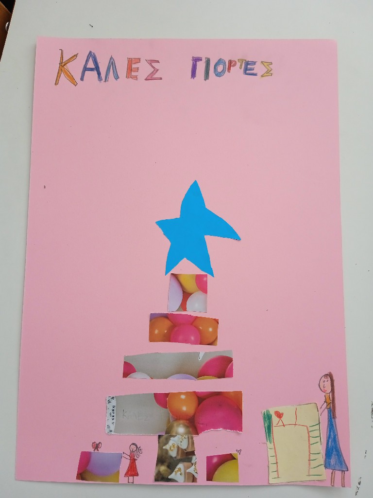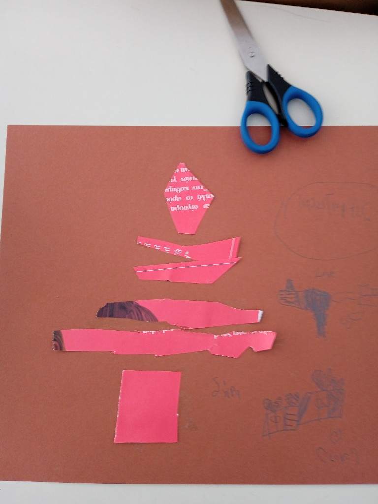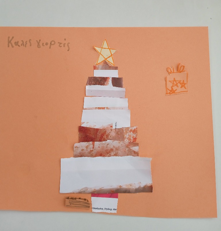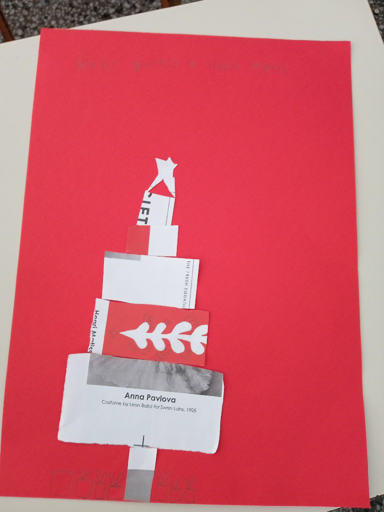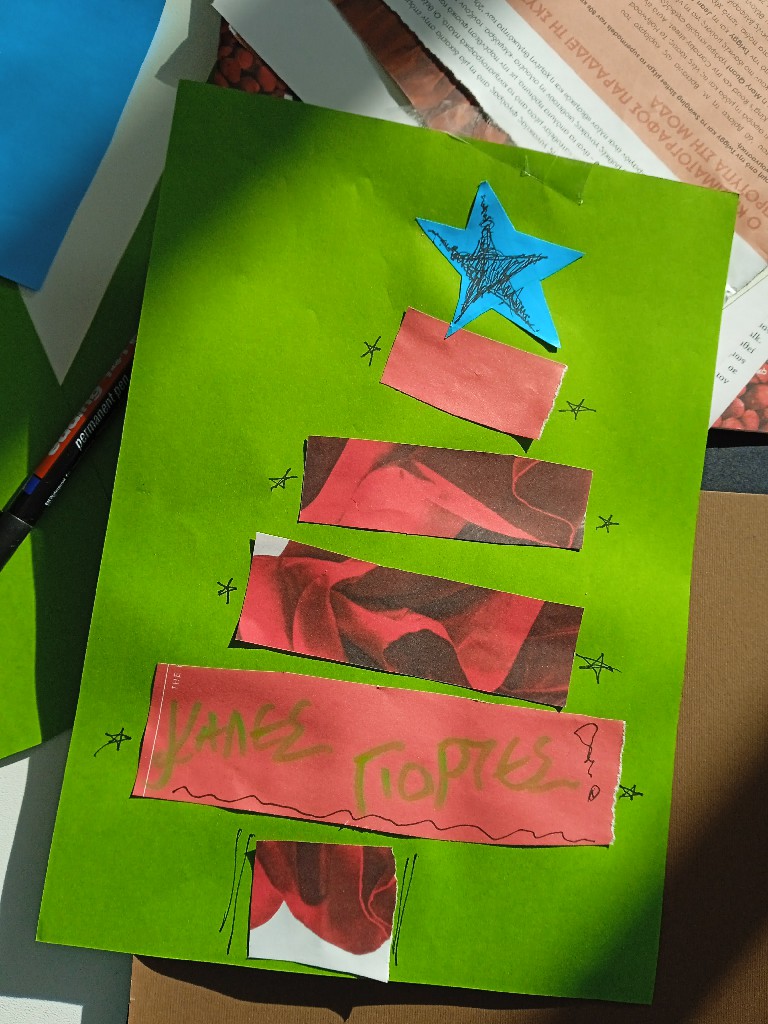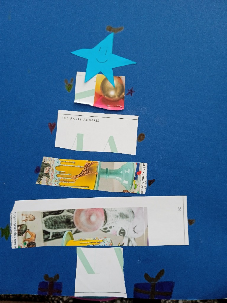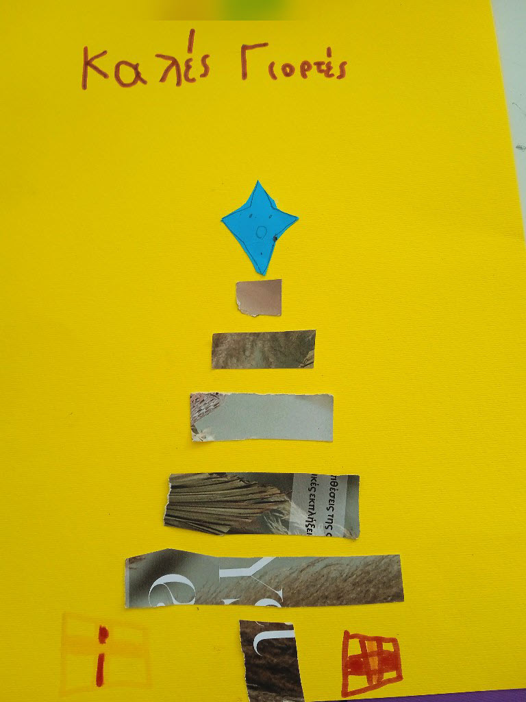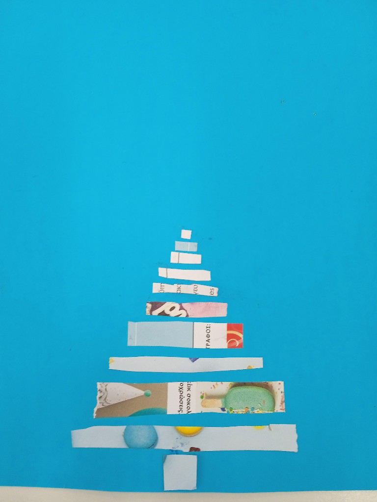Γι’ αυτό και ξεκινήσαμε τις εικαστικές δημιουργίες του Δεκέμβρη, εξασκώντας τη λεπτή μας κινητικότητα, κόβοντας, κολλώντας και ταιριάζοντας τις χάρτινες λωρίδες μας ώστε να σχηματιστούν τα αφαιρετικά/κυβιστικά μας χριστουγεννιάτικα δέντρα!!