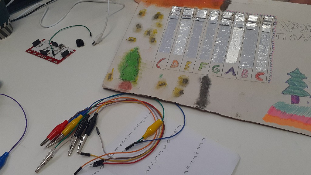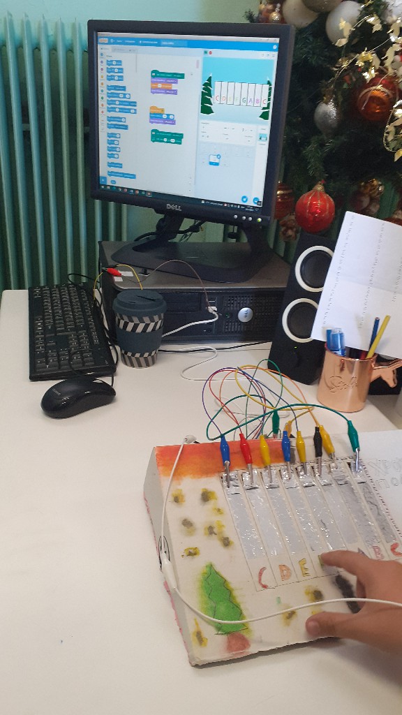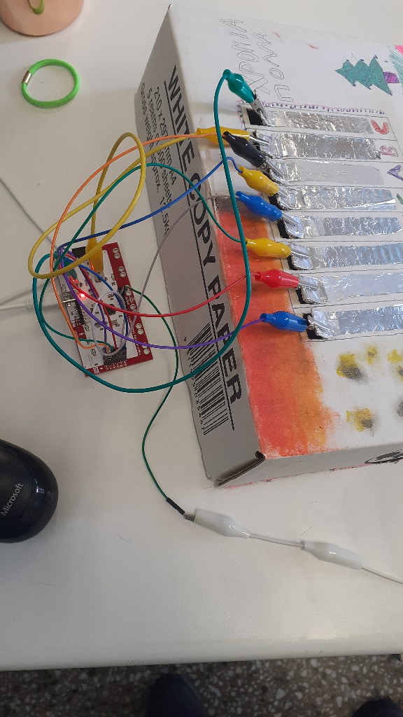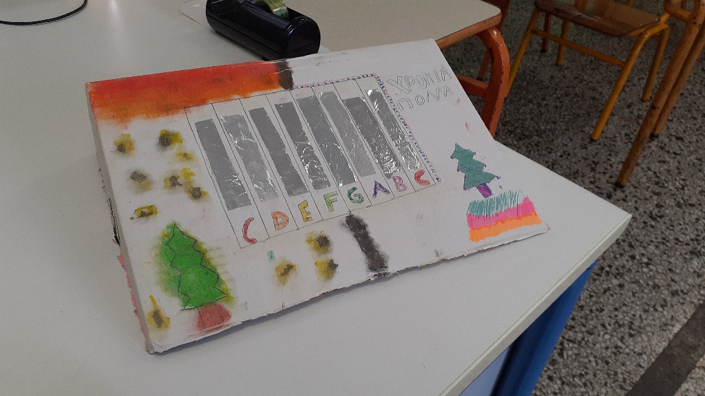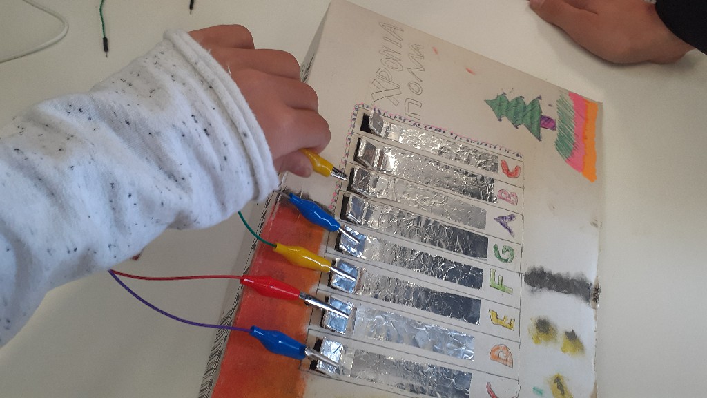 Λίγο πριν τις γιορτές των Χριστουγέννων, την τελευταία ώρα του Ολοήμερου προγράμματος κάθε Παρασκευής, οι μαθητές/τριες των Δ’, Ε’ & ΣΤ’ τάξεων δημιούργησαν ένα διαφορετικό πιάνο. Κατασκευάστηκε εξ ολοκλήρου από χαρτί για το σώμα και αλουμινόχαρτο για τα πλήκτρα. Παράλληλα με την κατασκευή του πιάνου, μία άλλη ομάδα δημιούργησε ένα πρόγραμμα εξομοίωσης πιάνου στον υπολογιστή της τάξης χρησιμοποιώντας την γλώσσα προγραμματισμού Scratch. Ο σκοπός μας ήταν η σύνδεση του πιάνου μας στον υπολογιστή μέσω του Makey Makey, μίας μικρής πλακέτας η οποία μετατρέπει οποιονδήποτε καλό αγωγό ηλεκτρισμού σε πλήκτρο υπολογιστή! Με άλλα λόγια οι μαθητές/τριες δημιούργησαν ηλεκτρικά κυκλώματα! Ένα ηλεκτρικό κύκλωμα για κάθε πλήκτρο του πιάνου μέσω των οποίων το πιάνο επικοινωνούσε με τον υπολογιστή!
