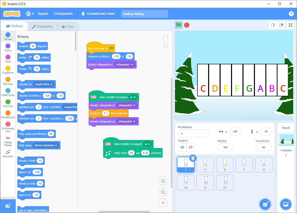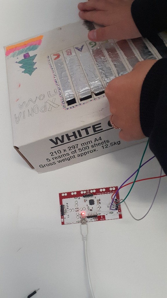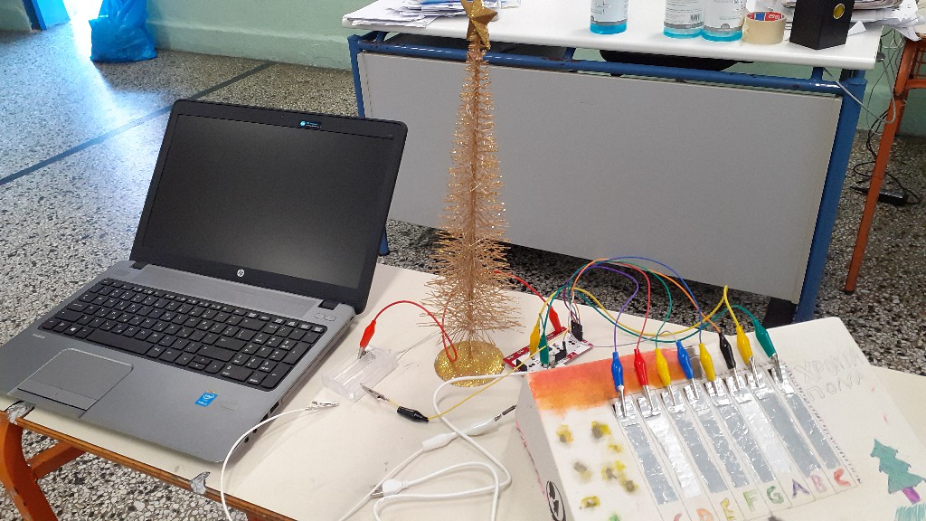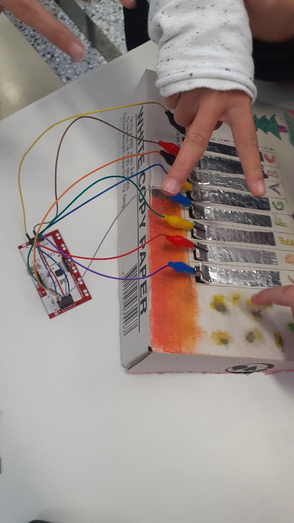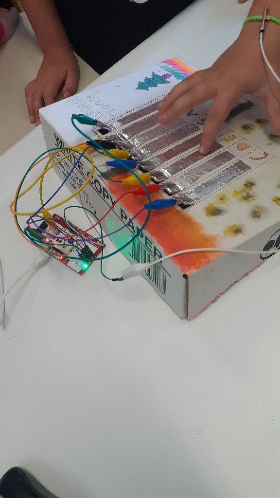 Λίγο πριν τις γιορτές των Χριστουγέννων, την τελευταία ώρα του Ολοήμερου προγράμματος κάθε Παρασκευής, οι μαθητές/τριες των Δ’, Ε’ & ΣΤ’ τάξεων δημιούργησαν ένα διαφορετικό πιάνο. Κατασκευάστηκε εξ ολοκλήρου από χαρτί για το σώμα και αλουμινόχαρτο για τα πλήκτρα. Παράλληλα με την κατασκευή του πιάνου, μία άλλη ομάδα δημιούργησε ένα πρόγραμμα εξομοίωσης πιάνου στον υπολογιστή της τάξης χρησιμοποιώντας την γλώσσα προγραμματισμού Scratch. Ο σκοπός μας ήταν η σύνδεση του πιάνου μας στον υπολογιστή μέσω του Makey Makey, μίας μικρής πλακέτας η οποία μετατρέπει οποιονδήποτε καλό αγωγό ηλεκτρισμού σε πλήκτρο υπολογιστή! Με άλλα λόγια οι μαθητές/τριες δημιούργησαν ηλεκτρικά κυκλώματα! Ένα ηλεκτρικό κύκλωμα για κάθε πλήκτρο του πιάνου μέσω των οποίων το πιάνο επικοινωνούσε με τον υπολογιστή!