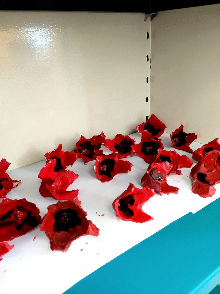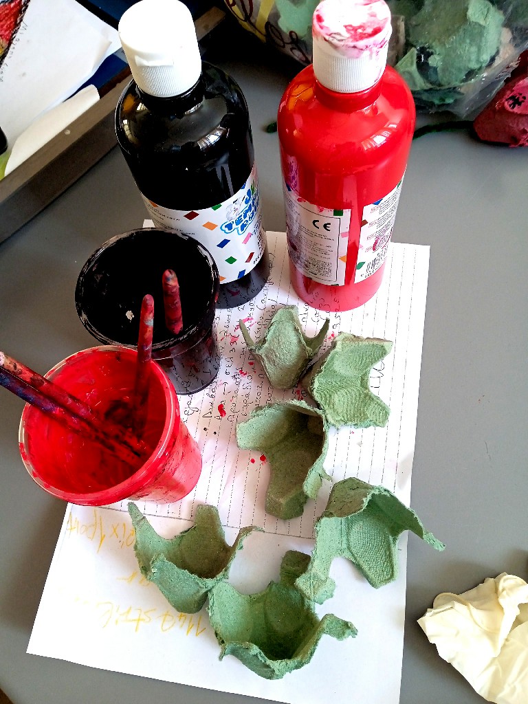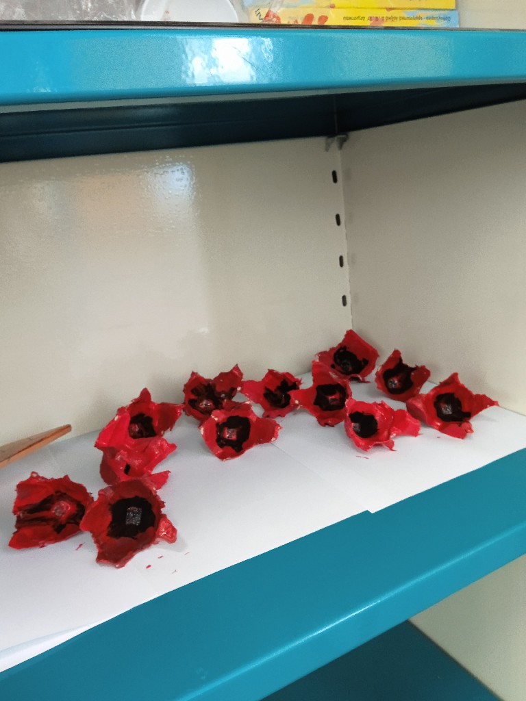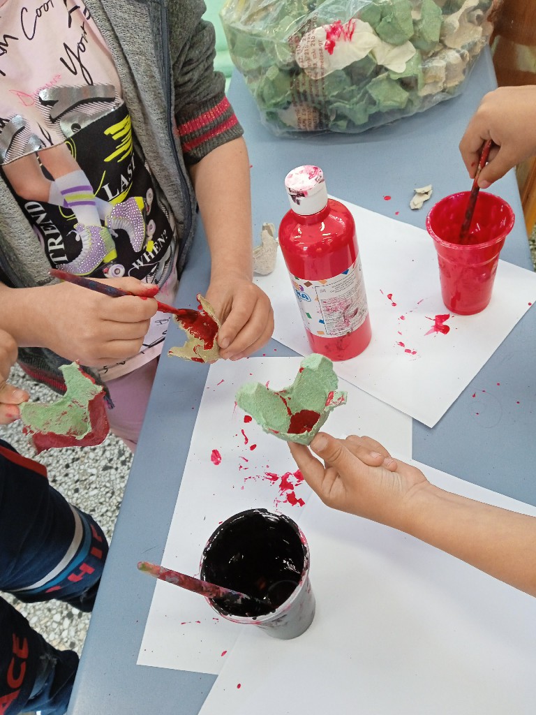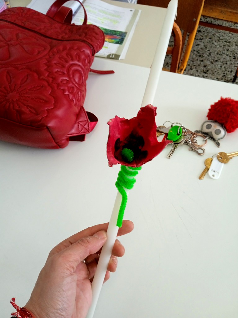 Παπαρουνολαμπάδες κατασκεύασε όλο το σχολείο!!! Συλλέξαμε και κόψαμε τις αυγοθήκες σε… ξεχωριστά λουλούδια. Τα χρωματίσαμε παπαρουνίσια και αφού στέγνωσαν, διακόσμησαν το λευκό κερί.